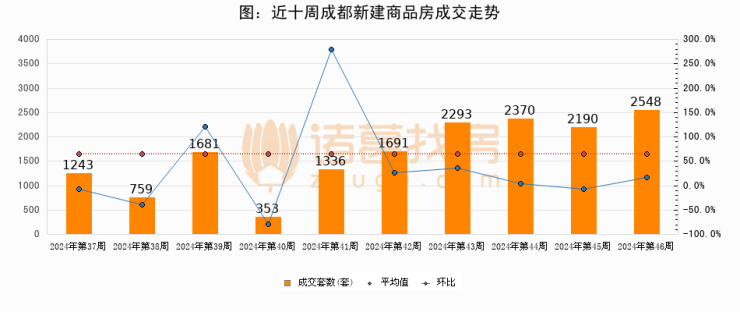 进入2024年第46周(11月11日-11月17日),成都新建商品房成交2548套,较上周增加358套,环比上涨16.4%
