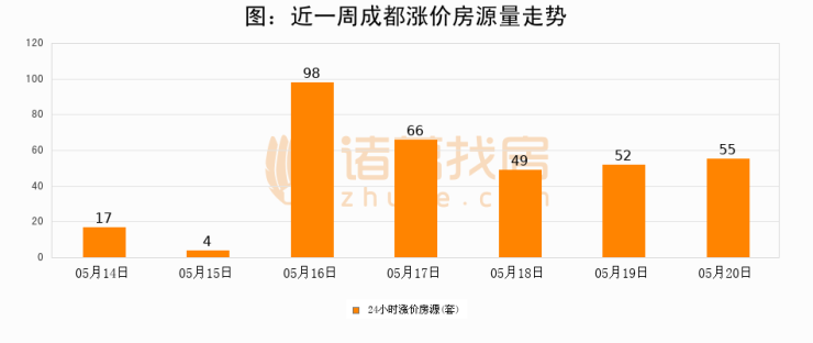 根据诸葛找房数据显示,成都24小时涨价房源量为55套,较05月19日增加3套,环比上涨5.8%。与此同时,涨价房源占比小幅扩大,业主信心有所提升。