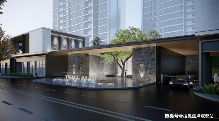 主入口采用门庭与景观一体化设计。超30米阔尺仪门与约5.6米挑高,采用深灰石材墙面与铝板顶饰,彰显尊崇气质;