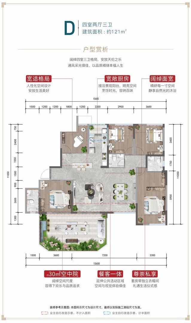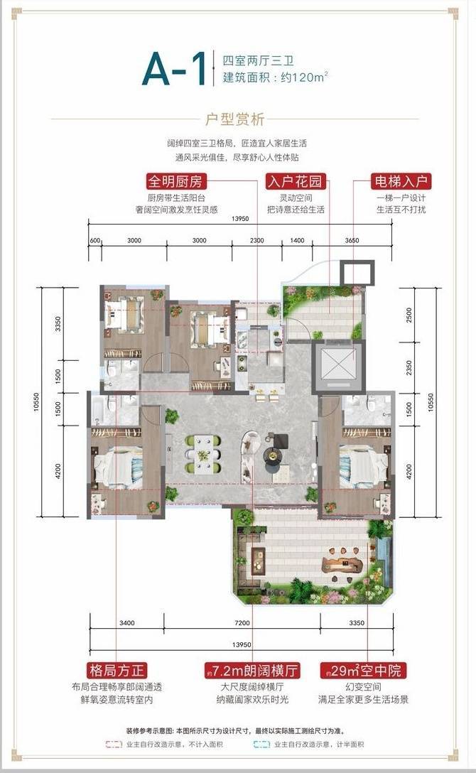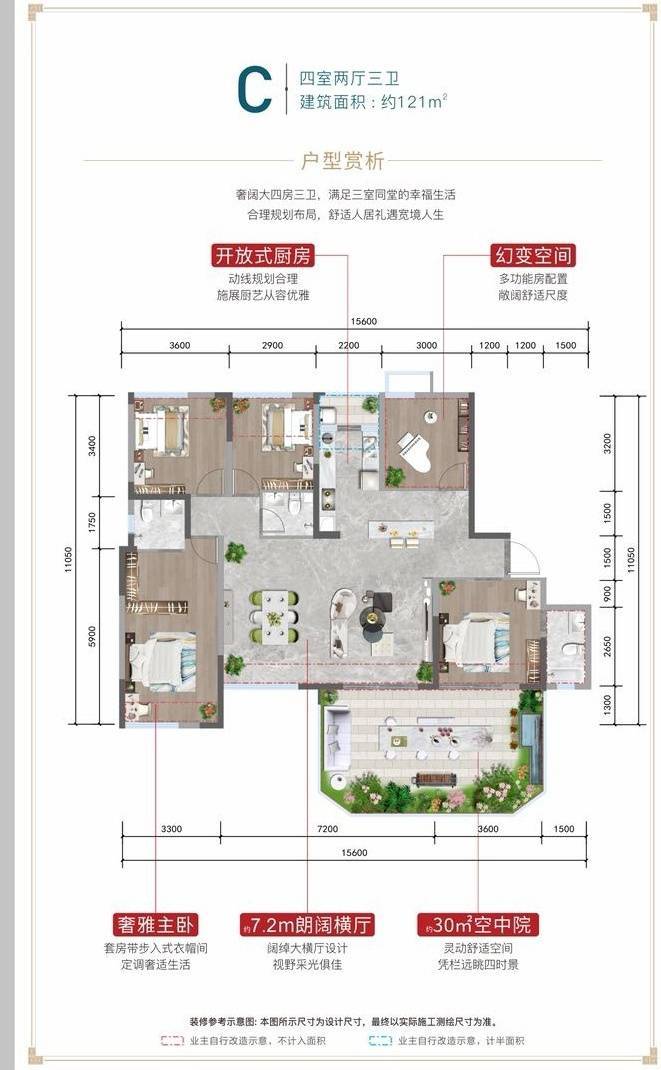 面积:120㎡实得180㎡(2梯2)121㎡最大实得188㎡(2梯3);主力户型121㎡
