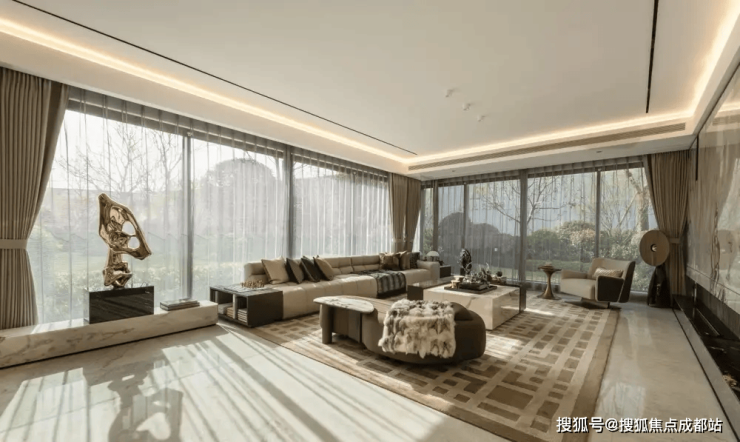 建筑采用全玻璃幕墙+铝板外立面,简约大气且极具辨识度,与交子双塔、交子公园景观交相辉映,成为金融城天际线的亮眼一笔[4];社区内部打造沉浸式园林,融合川西园林意境与现代设计美学,全冠移植名贵树种,搭配迭台水景、景观廊道,实现“推窗见绿、移步换景”。目前主推240-420㎡顶豪大平层,总价1500万起,适配金融精英、企业家等塔尖人群。