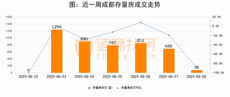 从存量房来看,2025年06月28日成都存量房单日成交78套,比昨日减少610套,环比下降88.7%。从近一周存量房成交来看,成都存量房日均成交套数为648套,06月28日单日成交78套,低于近一周平均水平88%。