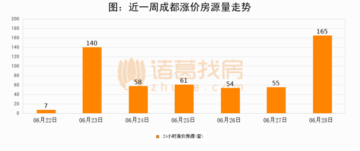 根据诸葛找房数据显示,成都24小时涨价房源量为165套,较06月27日增加110套,环比上涨200%。与此同时,涨价房源占比小幅扩大,业主信心有所提升。