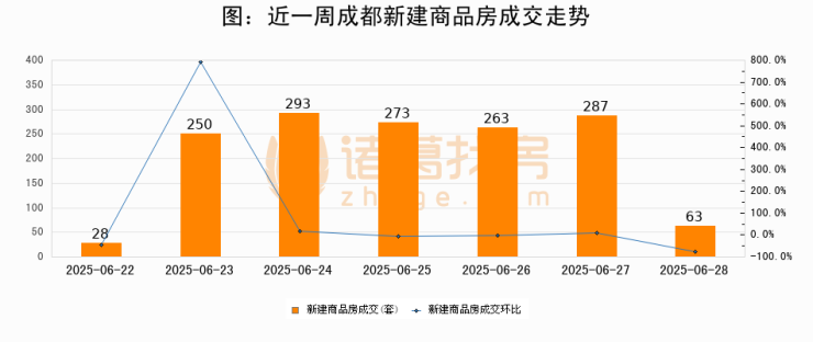 根据成都市住房和城乡建设局数据显示,2025年06月28日成都新建商品房成交63套,较昨日减少224套,环比下降78%