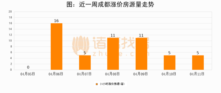 根据诸葛找房数据显示,成都24小时涨价房源量为5套,较04月10日持平。