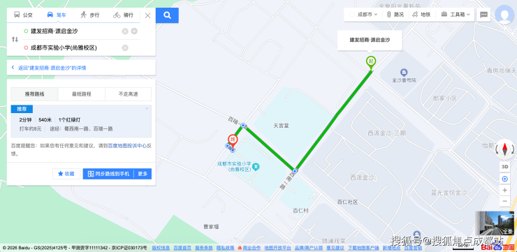 实测源启金沙到实验小学尚雅校区600米内