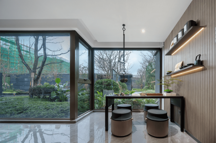 在流线型阳台的基础上,局部进深放大至约2.4m,形成一处近乎正方形的活动空间。在业主眼中,住进去后足够布置茶室、书吧、儿童活动空间等;在业内人士眼中,局部放大的阳台延伸了客厅面积,让126㎡拥有140㎡+的既视感。