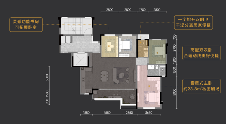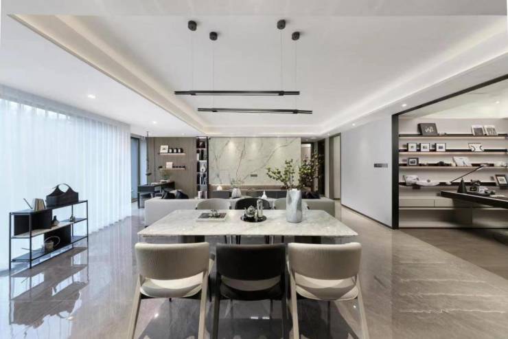 3)大面宽横厅设计:形态上主流是竖厅,缺乏横厅的气场。九里璟颂却在四居功能上设计约6.9m的客厅开间,让大横厅的气势感溢于言表,可以说,在龙湖·九里璟颂里,可以为家庭欢聚带来无限空间可能。