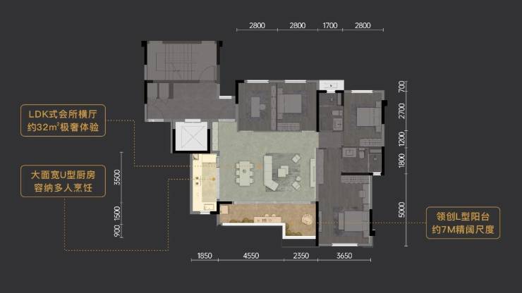 4)约32㎡城市会客厅,形成超大的聚合空间,加上开间约6.9m奢阔全景阳台,龙湖独创的L型阳台色也是神来之笔,对于这种设计,其他品牌产品也出现过类似做法,不过多数都出现在140㎡以上的户型中。