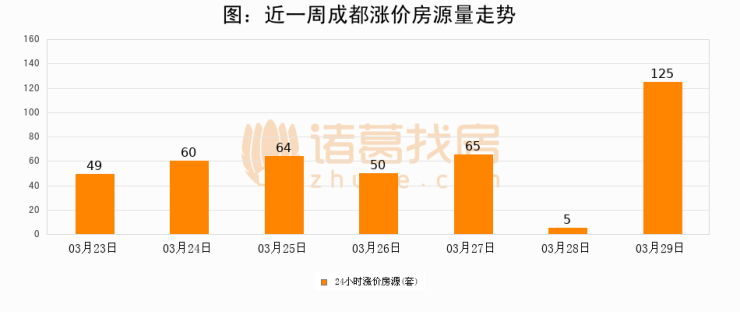 根据诸葛找房数据显示,成都24小时涨价房源量为125套,较03月28日增加120套,环比上涨2400%。与此同时,涨价房源占比小幅扩大,业主信心有所提升。