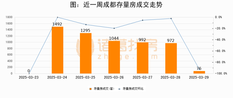 从存量房来看,2025年03月29日成都存量房单日成交76套,比昨日减少896套,环比下降92.2%。从近一周存量房成交来看,成都存量房日均成交套数为838套,03月29日单日成交76套,低于近一周平均水平90.9%。