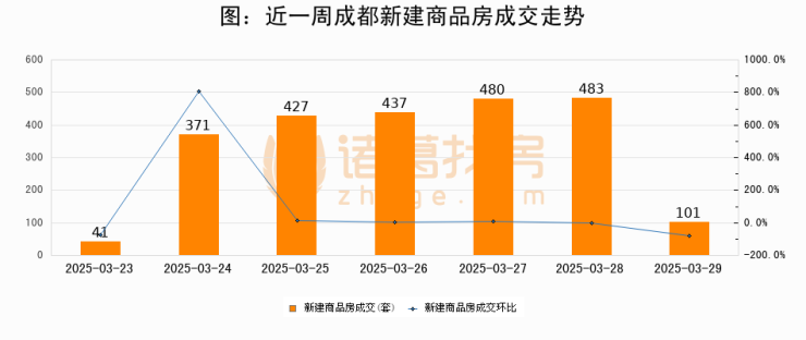 根据成都市住房和城乡建设局数据显示,2025年03月29日成都新建商品房成交101套,较昨日减少382套,环比下降79.1%