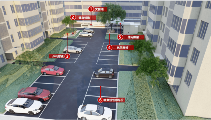 改造内容包括供电、供水、燃气户表改造,屋顶防水、雨污分流、增加大门门禁系统、监控系统、增设车棚及充电桩、规划院内停车位、围墙整治、楼道更新、增加健身休憩设施等多个项目。