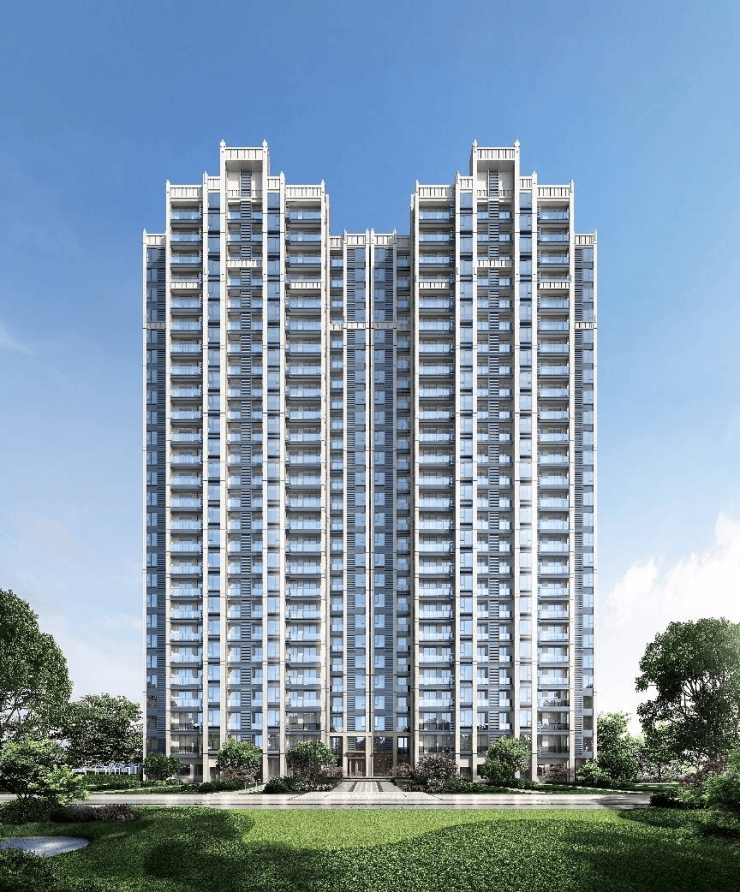 现代建筑美学:以灰色基调搭配米白色线条,配以浅蓝灰玻璃幕墙,塑造简约典雅的轻奢立面