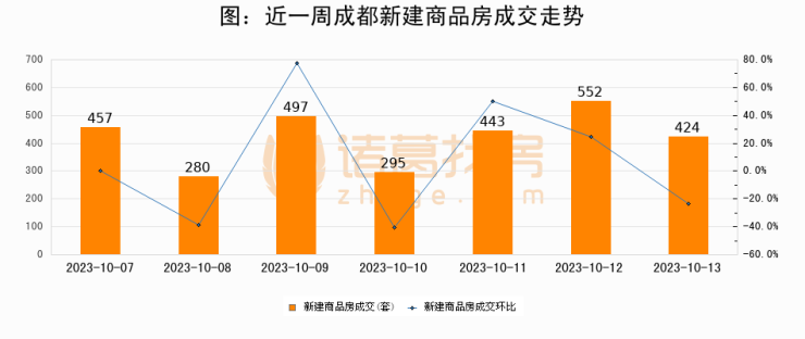 根据成都市住房和城乡建设局数据显示,2023年10月13日成都新建商品房成交424套,较昨日减少128套,环比下降23.2%