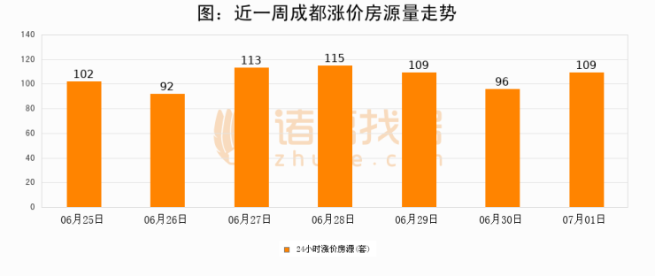 根据诸葛找房数据显示,成都24小时涨价房源量为109套,较06月30日增加13套,环比上涨13.5%。与此同时,涨价房源占比小幅扩大,业主信心有所提升。