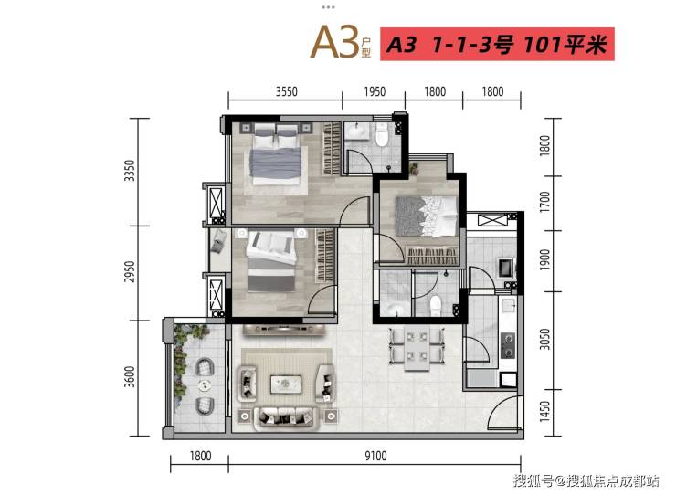 A3/A5户型 建筑面积约101㎡三室两厅两卫