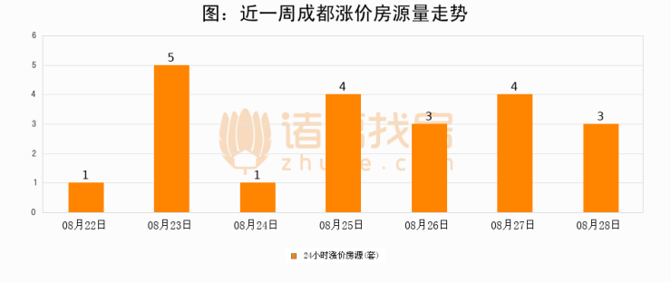 根据诸葛找房数据显示,成都24小时涨价房源量为3套,较08月27日减少1套,环比下降25%。与此同时,涨价房源占比小幅回落,对于购房者来说是一个入市窗口期,购房者可抓住时机入市。