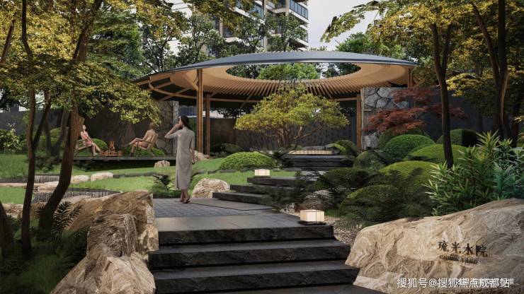 园林景观:双层叠水水景园林,采用印度绿奢石与法式拱券设计,打造南法优雅度假风。