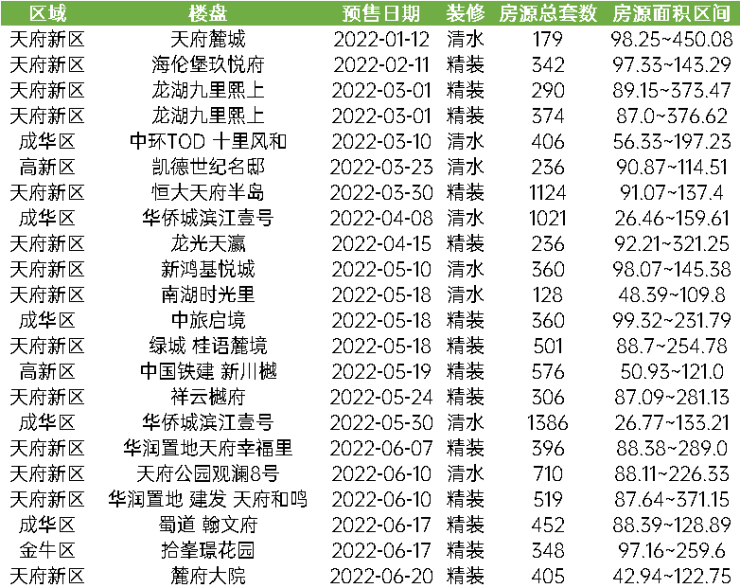 我们预计下半年仍有部分红盘将会陆续推出,如天府新区的新鸿基悦城、川发天府上城,高新区的嘉悦汇、长冶南阳御龙府,青羊区的光华壹号、鹭岛金沙壹品等。