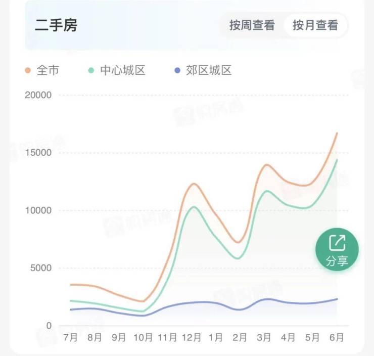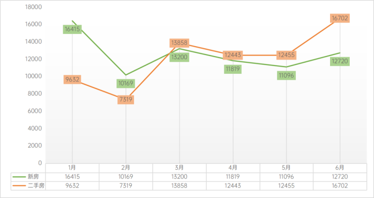6月,成都市二手房成交量激增,突破16000套,环比上升约34%。带动整个上半年二手房成交量突破70000套,更是达到了2018年下半年以来的历史新高,同比增长约259%。