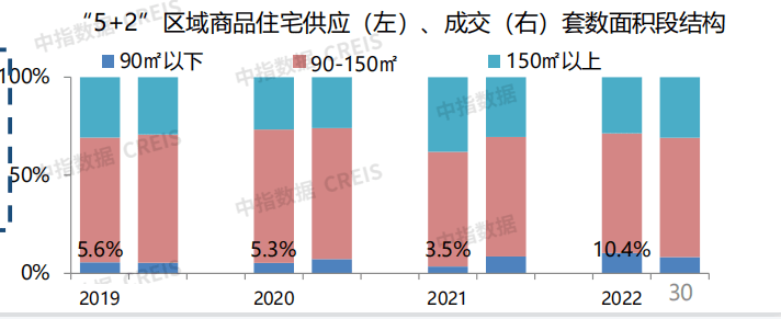 不过值得深思的是,据中指研究院统计发现,或因价格与人才公寓门槛的原因,建面90㎡以下成交占比仍为8.2%,持平2021年。