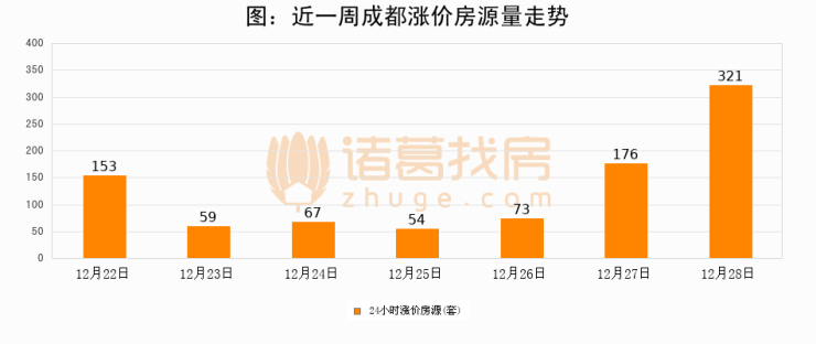 根据诸葛找房数据显示,成都24小时涨价房源量为321套,较12月27日增加145套,环比上涨82.4%。与此同时,涨价房源占比小幅扩大,业主信心有所提升。
