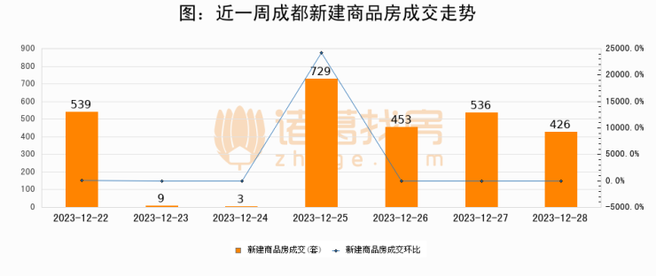 根据成都市住房和城乡建设局数据显示,2023年12月28日成都新建商品房成交426套,较昨日减少110套,环比下降20.5%