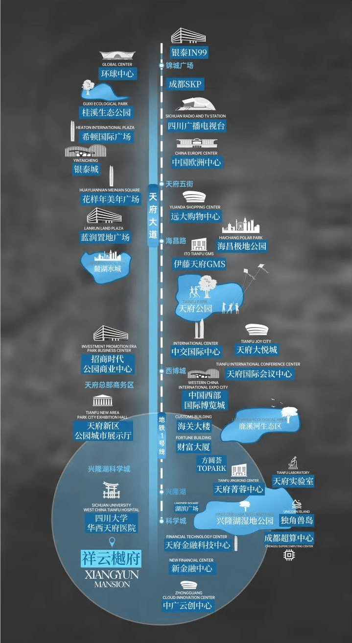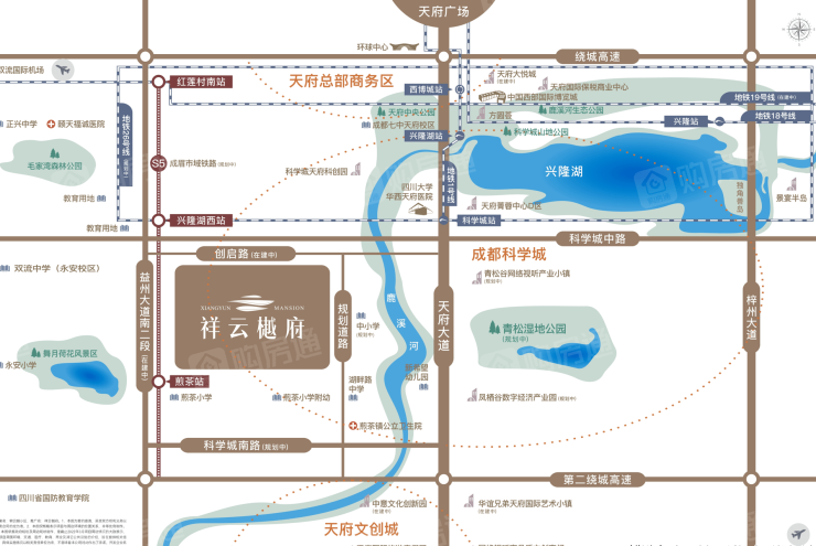 祥云越府位于天府新区兴隆湖科学城。兴隆湖作为天府新区的"心脏”,被视为成都未来的科技经济重要增长点,它是成都公园城市理念的策源地,也是完美演绎成都公园城市的示范之地,更是现代湖居生活集大成者。