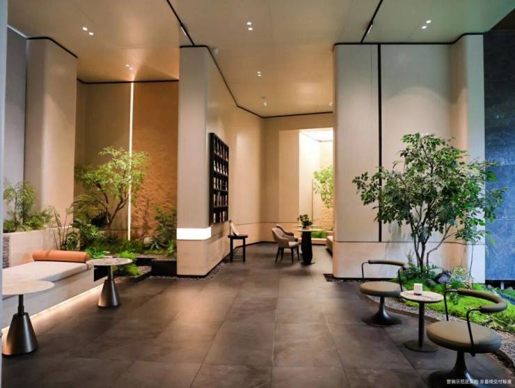 公共空间营造:入口大门选用白冰玉石材手工精琢,架空层与入户大堂铺设法国木纹大理石,地上大堂面积自90㎡起,地下大堂配置劳斯莱斯同款星空顶设计,双大堂均配备冷暖空调系统,营造星级酒店式归家体验。
