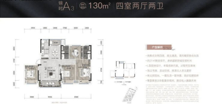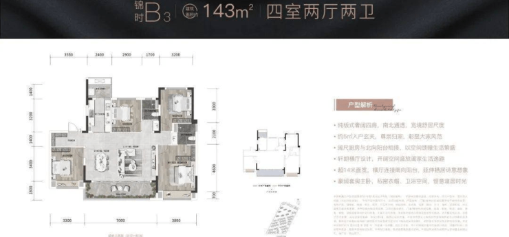 4房2厅2卫,层高3.1米,空间尺度开阔,超高得房率。
