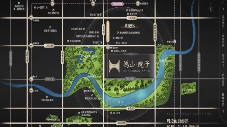 鸿山院子位于新都香城中心低密宜居板块,毗河生态带由西向东环抱项目,同时项目附近有已建成的泥巴沱森林公园一期(即将启动二期,新都中央森林公园建设),在建体育运动公园(预计22年底建成),及规划中的毗河公园,坐拥新都主城区一河三公园的天赋盛地。