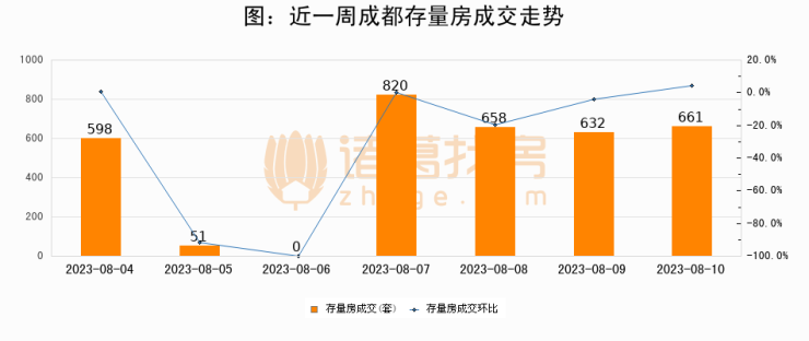 从存量房来看,2023年08月10日成都存量房单日成交661套,比昨日增加29套,环比上涨4.6%。从近一周存量房成交来看,成都存量房日均成交套数为488套,08月10日单日成交661套,高于近一周平均水平35.5%。