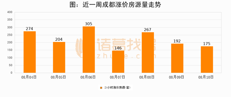 根据诸葛找房数据显示,成都24小时涨价房源量为175套,较08月09日减少17套,环比下降8.9%。与此同时,涨价房源占比小幅回落,对于购房者来说是一个入市窗口期,购房者可抓住时机入市。