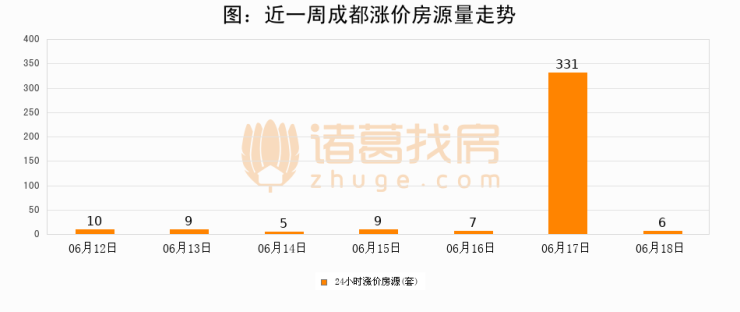 根据诸葛找房数据显示,成都24小时涨价房源量为6套,较06月17日减少325套,环比下降98.2%。与此同时,涨价房源占比小幅回落,对于购房者来说是一个入市窗口期,购房者可抓住时机入市。