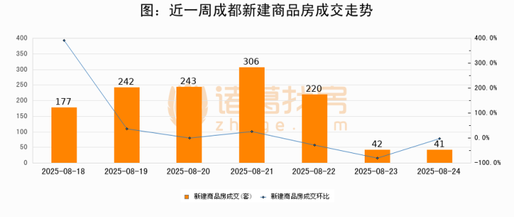 根据成都市住房和城乡建设局数据显示,2025年08月24日成都新建商品房成交41套,较昨日减少1套,环比下降2.4%
