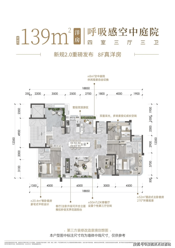 建面139㎡全四房(高端进阶首选):总价500万出头,9-11层洋房,得房率121%,约8㎡空中庭院,主卧面积达32㎡,配备四分离+双台盆主卫、独立衣帽间,餐厅设独立岛台与双回游动线,适配高端进阶与终极改善家庭。