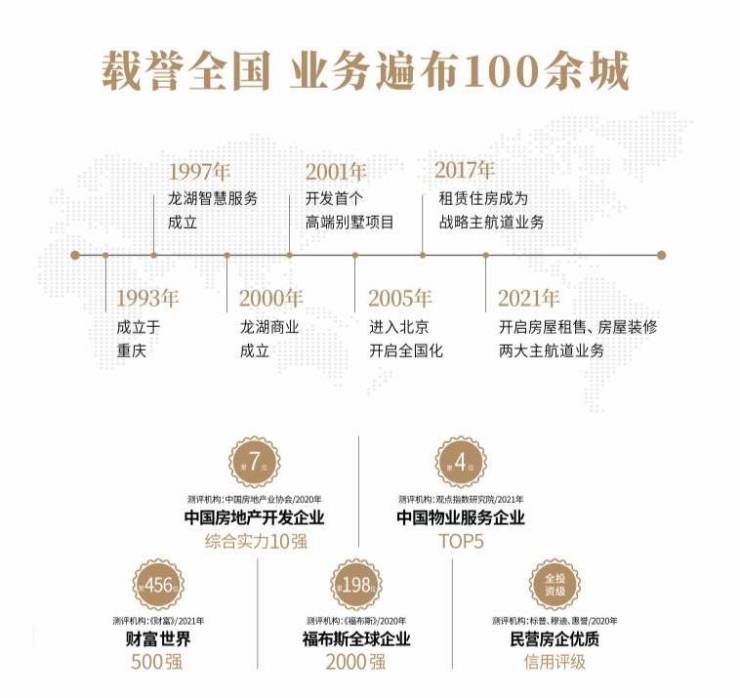 龙湖集团创立于1993年,总部设于北京,位列中国房地产企业综合实力十强。业务版图覆盖地产开发、商业运营、物业服务、长租公寓、房屋租售及装修等领域。