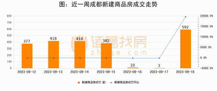 根据成都市住房和城乡建设局数据显示,2023年09月18日成都新建商品房成交592套,较昨日增加589套,环比上涨19633.3%