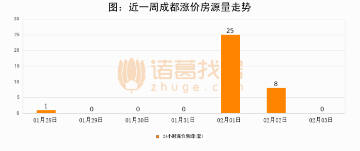 根据诸葛找房数据显示,成都24小时涨价房源量为0套,较02月02日减少8套,环比下降100%。与此同时,涨价房源占比小幅回落,对于购房者来说是一个入市窗口期,购房者可抓住时机入市。