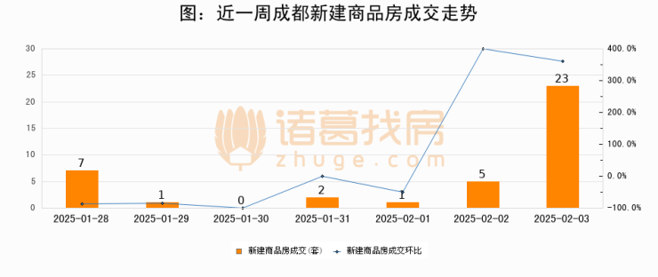根据成都市住房和城乡建设局数据显示,2025年02月03日成都新建商品房成交23套,较昨日增加18套,环比上涨360%