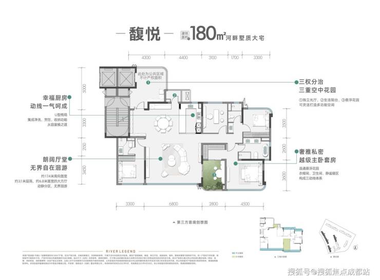 此户型拥有约17.4米的开阔视野面,能将室内空间充分打开,让室外美景自然融入室内。它还配备超级大方厅以及270度采光的豪华主卧套。其中7F纯洋房藏品更是稀缺,住户能奢享一线清水河岸线。面宽约6.8米的河景大方厅、面宽约4.5米的主卧套房、面宽约3.3米的次卧套房以及近10㎡的空中院馆均朝向清水河,让每一个生活的重要瞬间,都有宁静的河水相伴。建面约139㎡-四室三厅三卫双套房