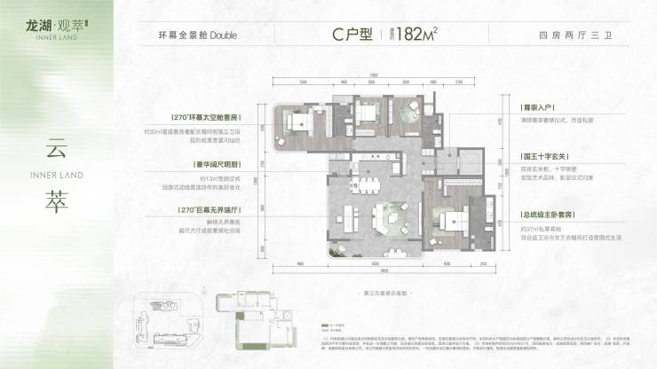 户型亮点:1T1户,四房三卫,L转角落地窗端厅,可享270度环幕采光。玄关左右动静分区,主卧套房与次卧套房隔开,提升了家庭成员间的隐私性。
