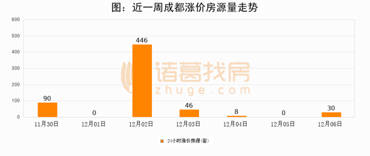 根据诸葛找房数据显示,成都24小时涨价房源量为30套,较12月05日增加30套,环比上涨0%。与此同时,涨价房源占比小幅扩大,业主信心有所提升。