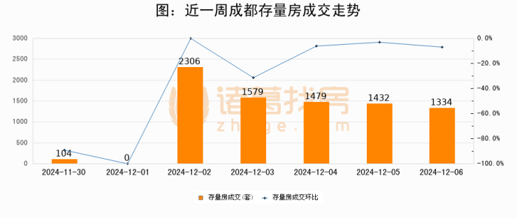 从存量房来看,2024年12月06日成都存量房单日成交1334套,比昨日减少98套,环比下降6.8%。从近一周存量房成交来看,成都存量房日均成交套数为1176套,12月06日单日成交1334套,高于近一周平均水平13.4%。
