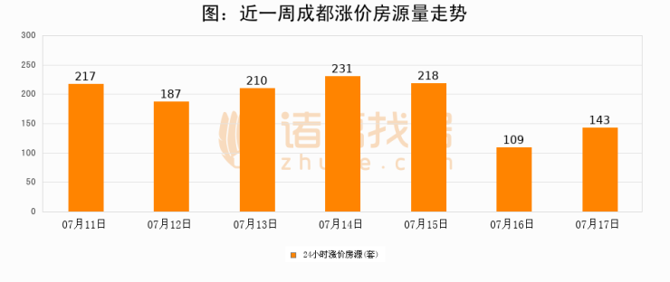 根据诸葛找房数据显示,成都24小时涨价房源量为143套,较07月16日增加34套,环比上涨31.2%。与此同时,涨价房源占比小幅扩大,业主信心有所提升。