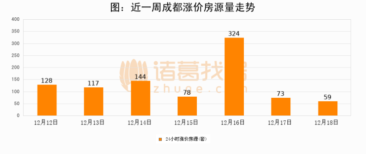 根据诸葛找房数据显示,成都24小时涨价房源量为59套,较12月17日减少14套,环比下降19.2%。与此同时,涨价房源占比小幅回落,对于购房者来说是一个入市窗口期,购房者可抓住时机入市。