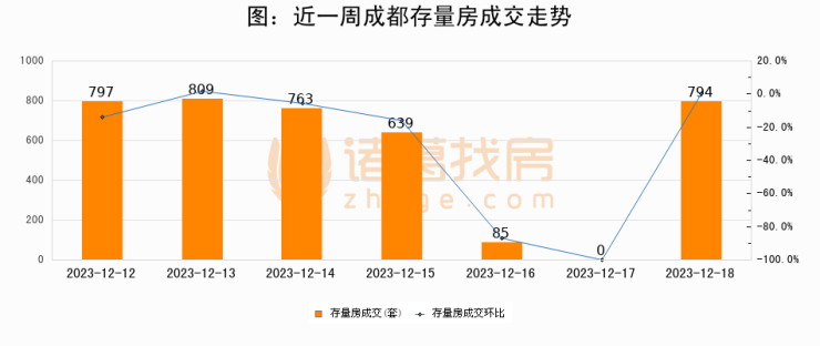 从存量房来看,2023年12月18日成都存量房单日成交794套,比昨日增加794套,环比上涨0%。从近一周存量房成交来看,成都存量房日均成交套数为555套,12月18日单日成交794套,高于近一周平均水平43.1%。