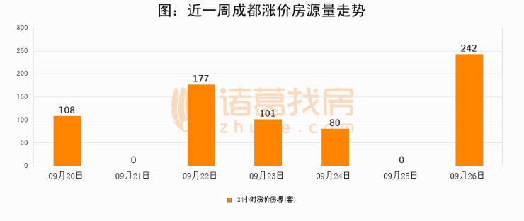 根据诸葛找房数据显示,成都24小时涨价房源量为242套,较09月25日增加242套,环比上涨0%。与此同时,涨价房源占比小幅扩大,业主信心有所提升。