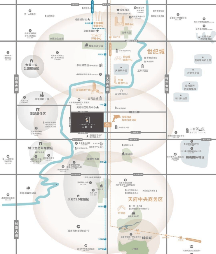 【三利广场】位于天府大道南段2034号,属麓山-麓湖板块,拥有成熟的城市配套,我们站在高新区与天府新区的战略交汇处,上承天府软件园、金融城、新川科技园,下接天府总部商务区、成都科学城等城市产业功能区,能同时享受两大区域发展的各种利好,在未来我们项目将占有更多的先机,必将成为城南新的地标。